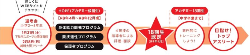 選考会で基準をクリアした者に対して意思確認を行い、「HOPE(アカデミー候補生)」に認定します。その後1年間、HOPEとして身体能力開発プログラムと4競技の競技適性プログラムを受講し、各競技の指導者より競技適性があると判断された者を令和8年4月に第17期生として正式に認定します。 |