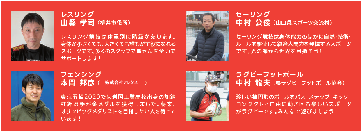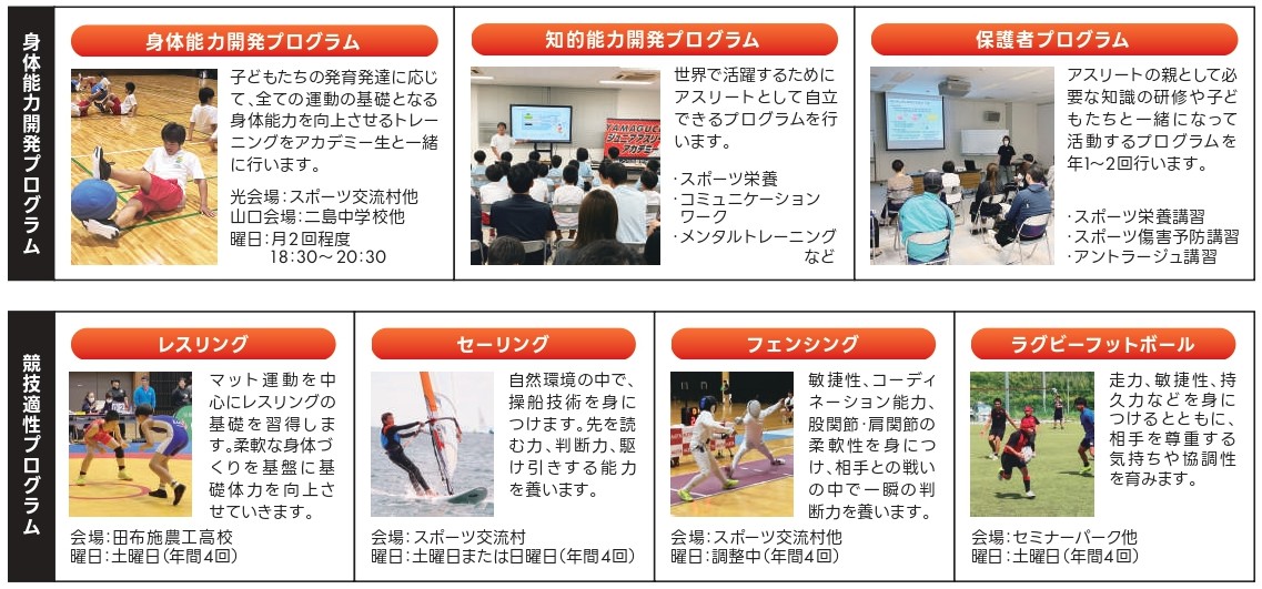 YAMAGUCHIジュニアアスリートアカデミーは、スポーツ能力に優れた児童を早期に発掘し、山口県から世界へ羽ばたくトップアスリートの人材育成を目標としています。「レスリング」と「セーリング」「フェンシング」「ラグビーフットボール」の4競技に特化してプログラムを展開しています。